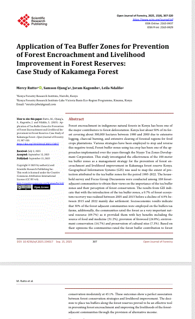 Citation: Rutto, M., Ojung’a, S., Kagombe, J. and Ndalilo, L. (2025). Ap plication of Tea Buffer Zones for Prevention of Forest Encroachment and Livelihood Im provement in Forest Reserves: Case Study of Kakamega Forest. Open Journal of Forestry, 15, 307-320.